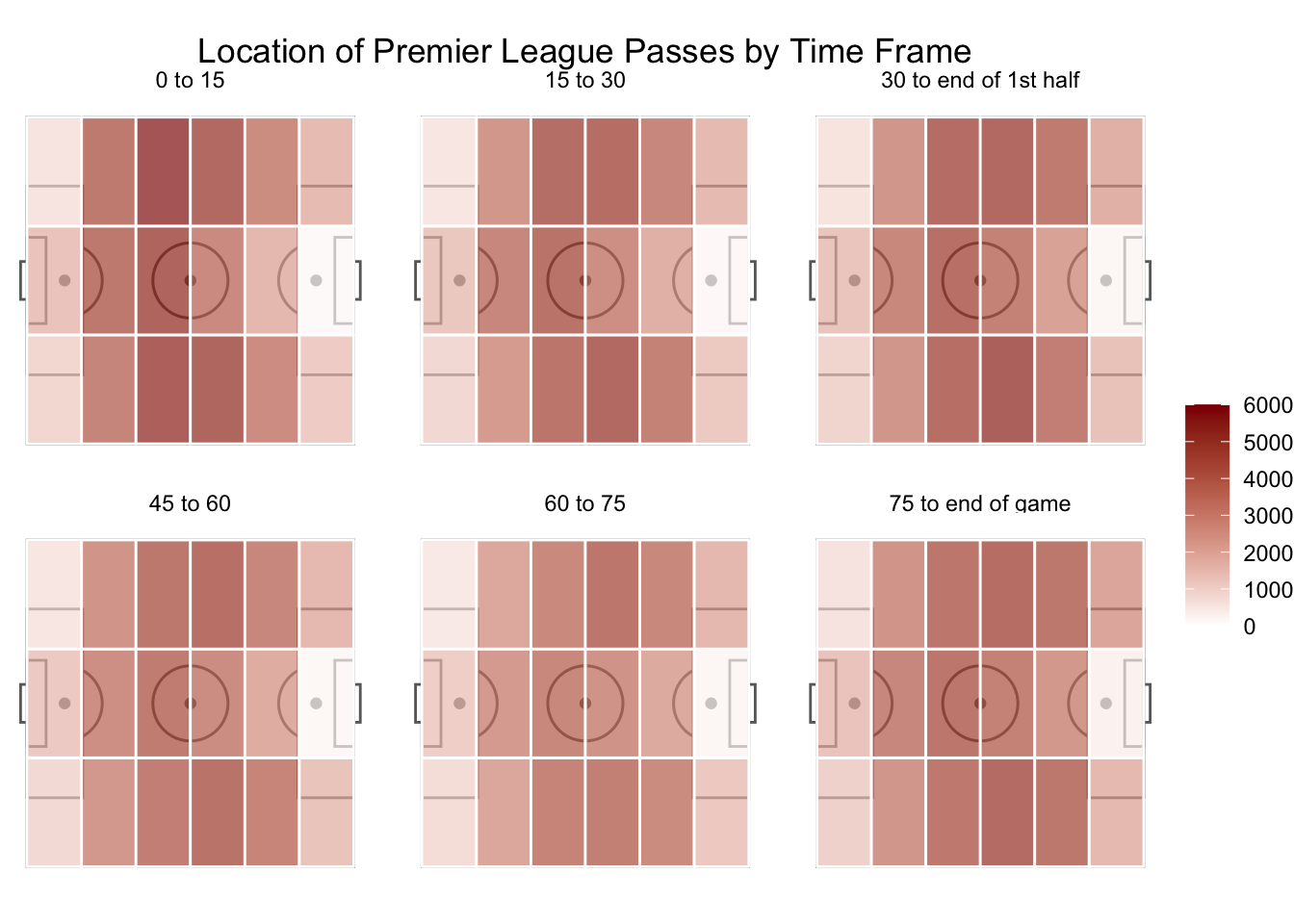 Then, the first variable we looked at in relation to passes was the time period of the match. We hypothesized that depending on the time of the game, the distribution of passes would vary given that teams may become more defensive or attacking minded throughout the course of the game. The matches were divided into 6, 15 minute segments, and then we plotted the total number of passes by zone in the Premier League across the whole season.