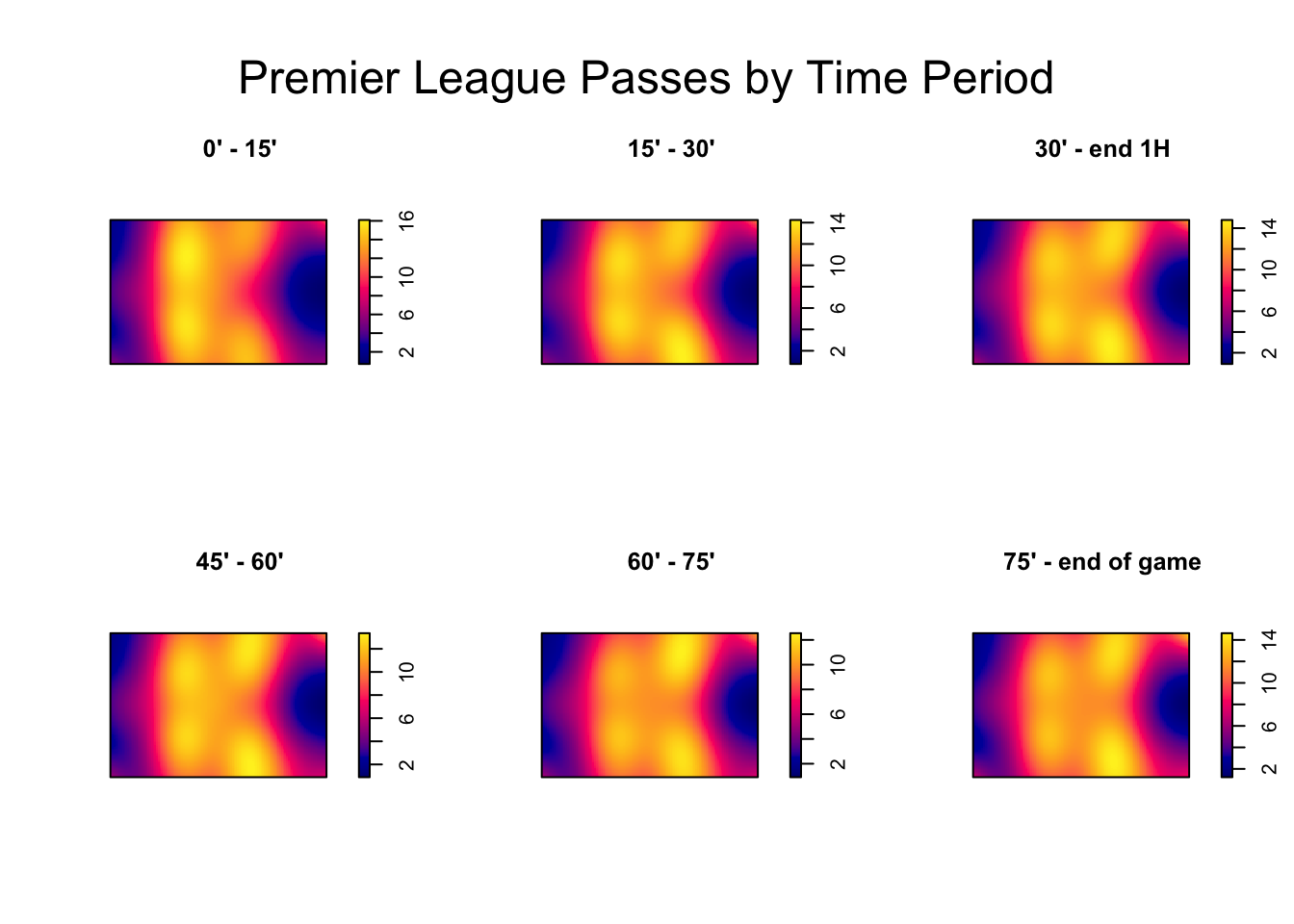 We do notice time influencing the location of passes, with a higher number of passes occurring in the defensive third at the start of the game, presumably when teams are just starting to settle into the game. As time progresses, passes gravitate more toward the attacking end of the field and are generally occurring more in wider areas of the pitch. Another way to visualize this is show below through kernel density plots. These highlight the locations of passes a bit better than the plot above, but do note that the intensity scales differ so it is not as good for comparing the true counts of passes in those locations.