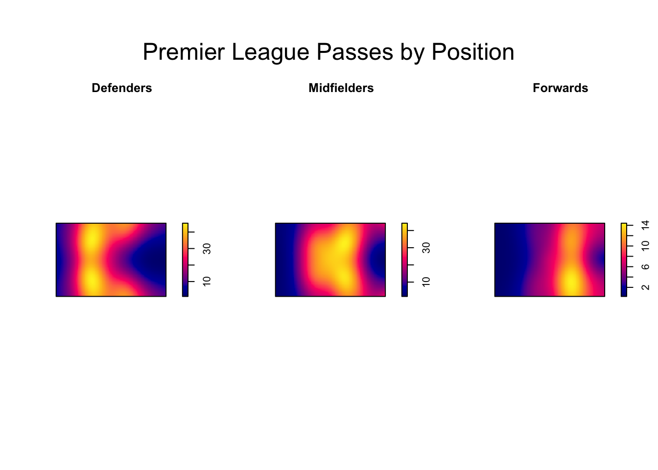 Another covariate we explored was the player’s assigned position, i.e. goalkeeper, defender, midfielder, or forward, with an added focus on the last three. Field players are arranged on the pitch according to these positions, and generally occupy the same sorts of spaces during the match. Defenders are usually the furthest back, midfielders in the middle, and forwards highest up the field. Because of this, we are curious to see how passes are distributed among these groups as we expect the locations to be somewhat correlated within positions and quite different between groups. A kernel density plot of Premier League passes by position in the 2017/18 season is shown below: