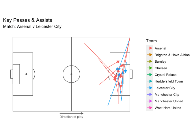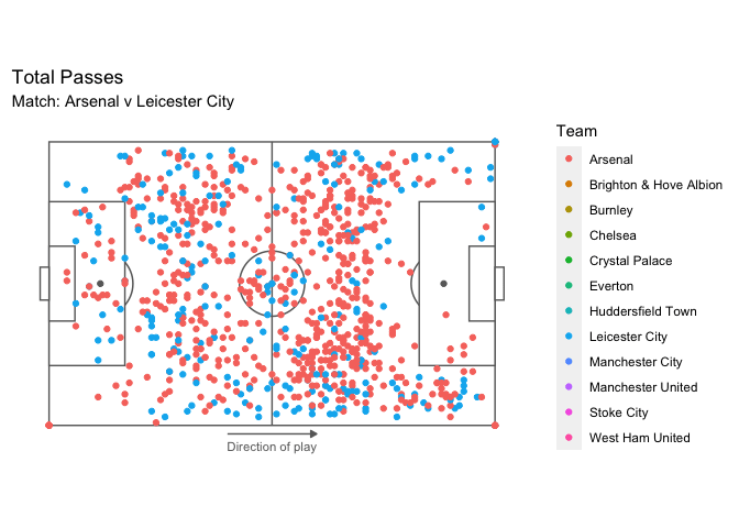 Within the animation, we can clearly see differences between each match, and we also see where the passes generally occur within the field. Notably, strong teams such as Manchester City, Manchester United, Arsenal, Liverpool or Chelsea clearly dominate the opposition in terms of the number of passes and pass location within the matches. They had greater numbers of passes that typically occurred closer to the opposition goal.