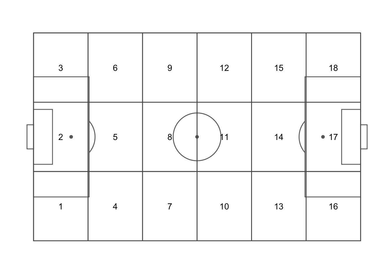 Next, we wanted to explore how different variables affected pass locations and their distribution. To do this we used the point process data and created an areal data set so we could look at aggregate summaries over different field locations. This will make it a bit easier to compare the overall number of passes that occur in a given zone based on factors like the team and time of the game. We divided the field into the following 18 zone grid, as this is a common way of dividing up a soccer field into smaller sections.
